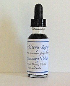 Elderberry syrup created by simmering down dried Elderberries with honey, fresh ginger root, cinnamon and clove and mixing in a 50% solution with Respiratory Tonic: Osha root, thyme, Mullein, tinctured in the sun in Rum